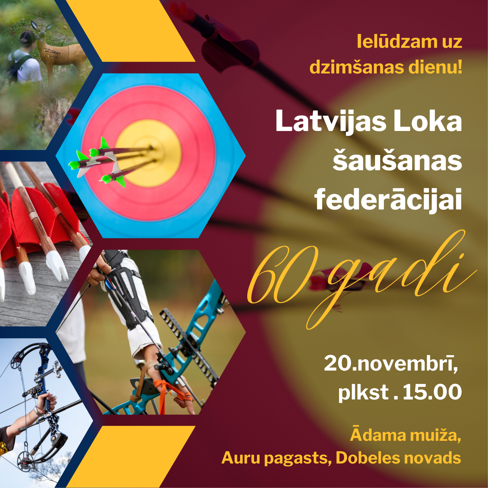 Latvijas loka šaušanas federācija ielūdz visus loka šāvējus un loka šāvēju atbalstītājus uz Federācijas 60 gadu jubilejas svinībām 2023.gada 20.novembrī plkst. 15.00 Ādama muižā, Auru pagastā, Dobeles novadā.